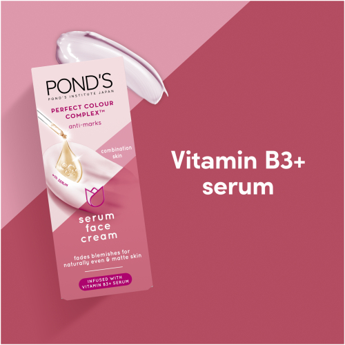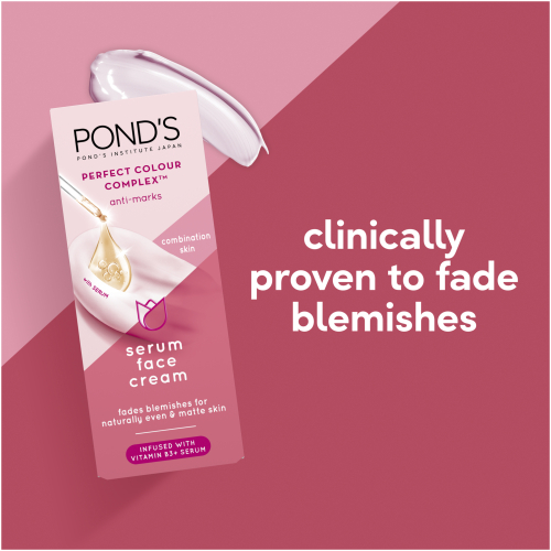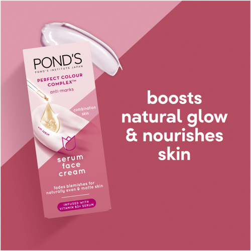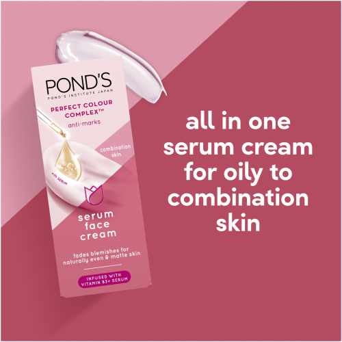 • Pond’s Perfect Colour Complex Anti Marks Serum Face Cream for Combination Skin is an All-in-One serum face cream to fade blemishes, control shine and moisturise combination skin.